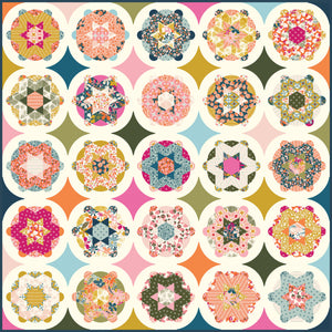 This striking quilt made using Eden by Gabrielle Neil uses both English Paper Piecing and Applique techniques. The quilt is made up of 25 blocks using 5 different EPP shapes.