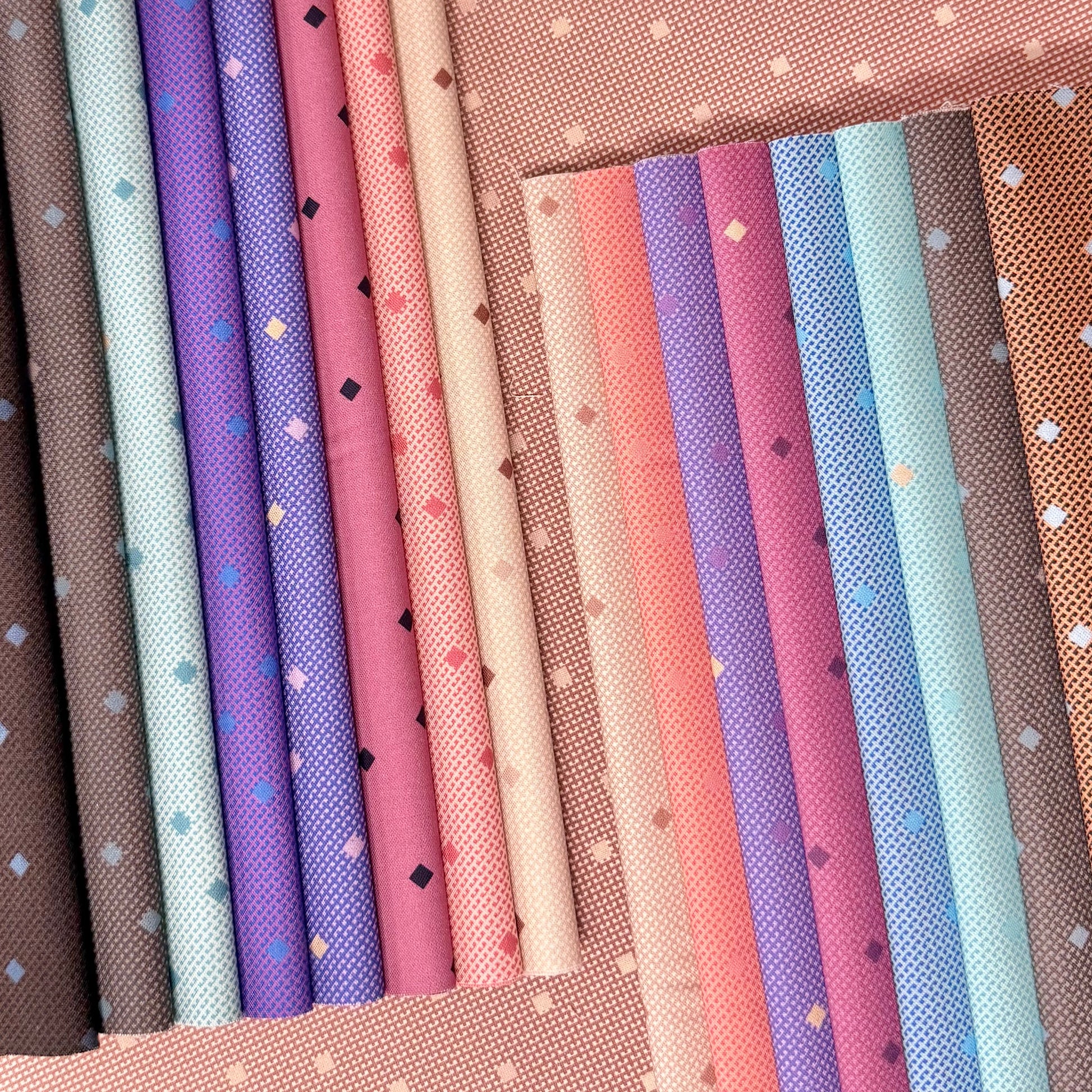 Dive into a shimmering spectrum with our Aurora Dreams fabric pack. Eight gemstone prints shift seamlessly from warm rose golds and corals to icy blizzards and deep ocean blues. Each 25cm cut reveals a gradient fade across the width, speckled with diamond motifs, meaning 8 fabrics give you 16 radiant colours. Perfect for quilts, patchwork, and projects that need both warmth and cool serenity.