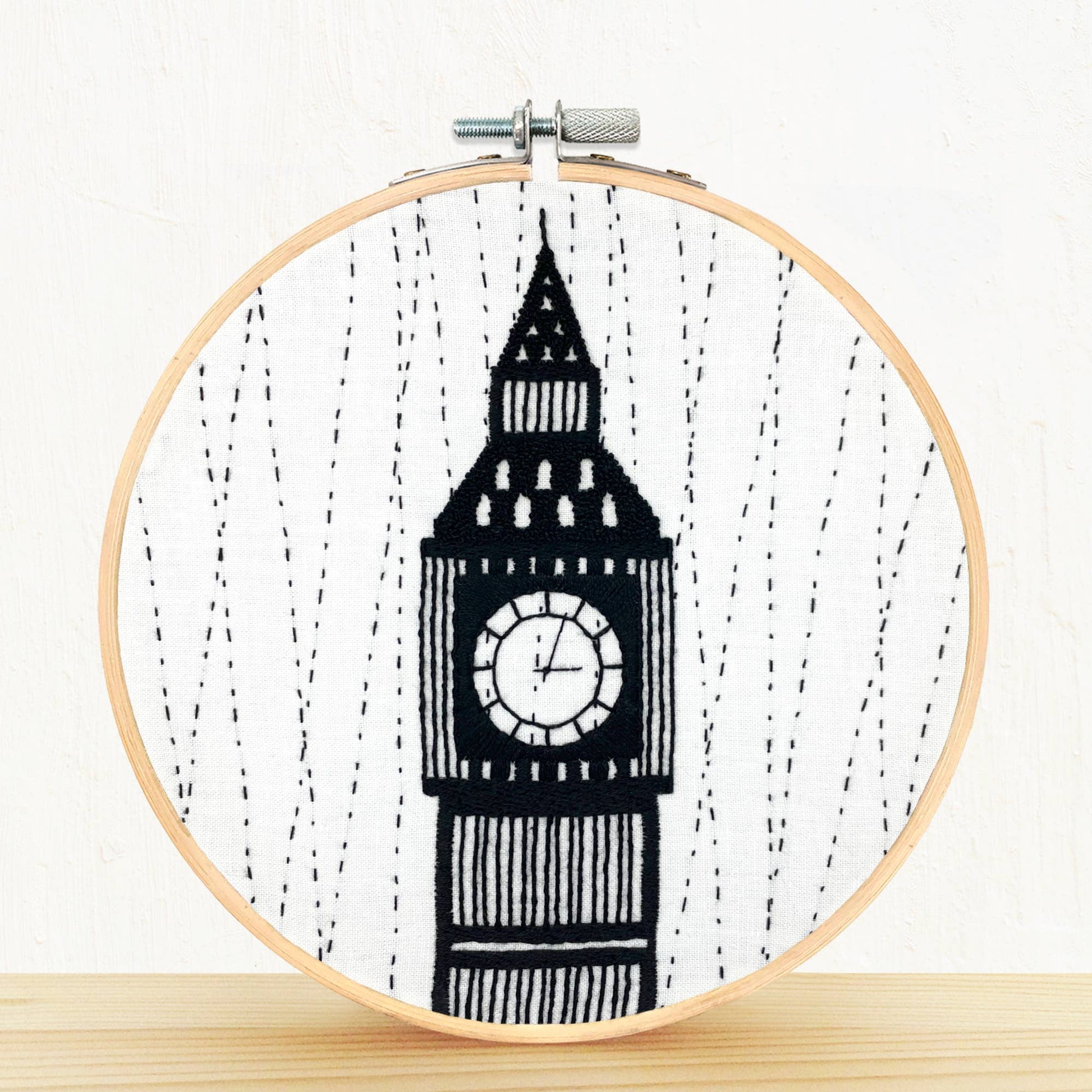 Hand-stitch the iconic Big Ben set against a charming, rainy London backdrop. This unique embroidery kit provides everything you need to complete a modern needlepoint project. With detailed instructions and links to video stitch tutorials, it is perfect for both beginners and experienced stitchers.