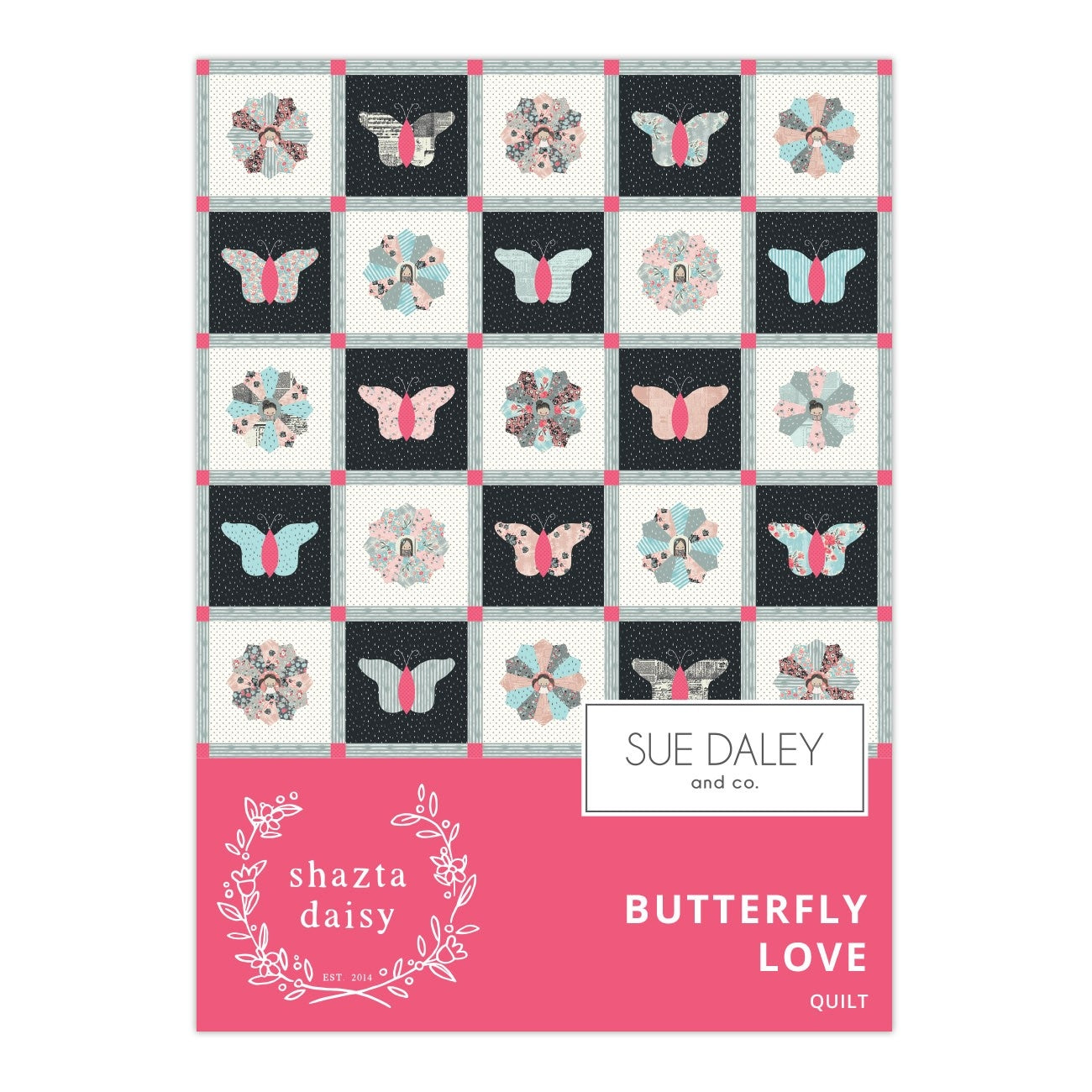 Der Quilt „Butterfly Love“ zeigt spitze Dresdner und applizierte Schmetterlinge. Von Shaztadaisy für Sue Daley & Co. entworfenes Muster mit englischem Paper Piecing und Applikation