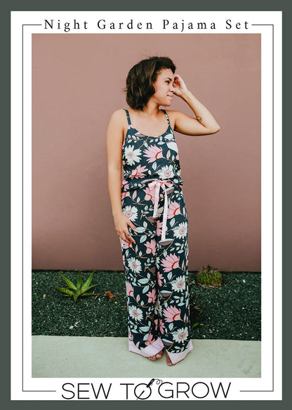 Gönnen Sie sich einen erholsamen Schlaf im Night Garden Pyjama-Set. Die Hose mit weitem Bein verfügt über ein Satinband zum Binden, Taschen und ein kontrastierendes Bündchen. Machen Sie sie alleine oder kombinieren Sie sie mit dem einfachen, verstellbaren Trägerhemd. Dieses Pyjama-Set lässt sich wunderbar aus Baumwolle in Steppstärke nähen oder aus Viskose für ein völlig luxuriöses Gefühl! Schlaf gut...