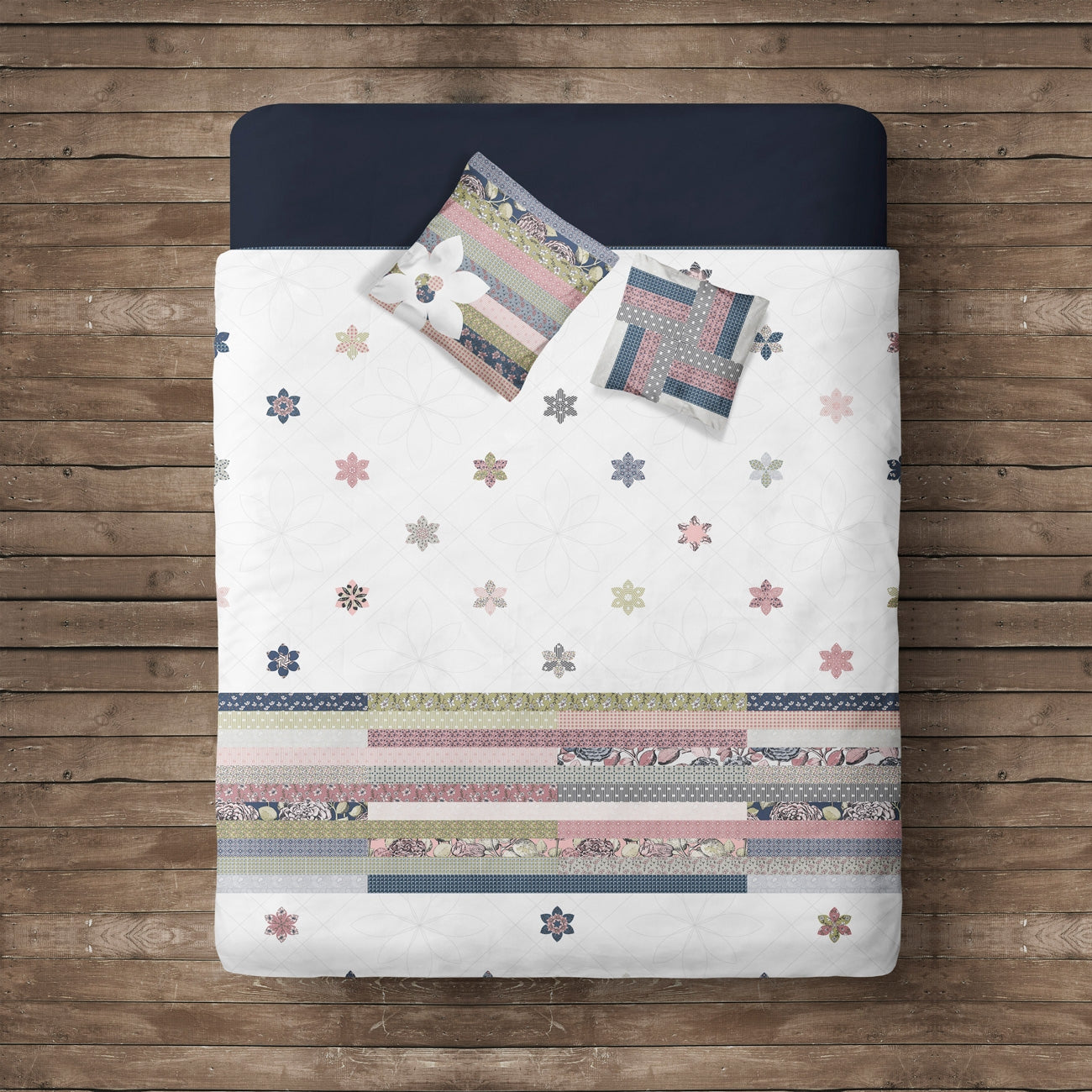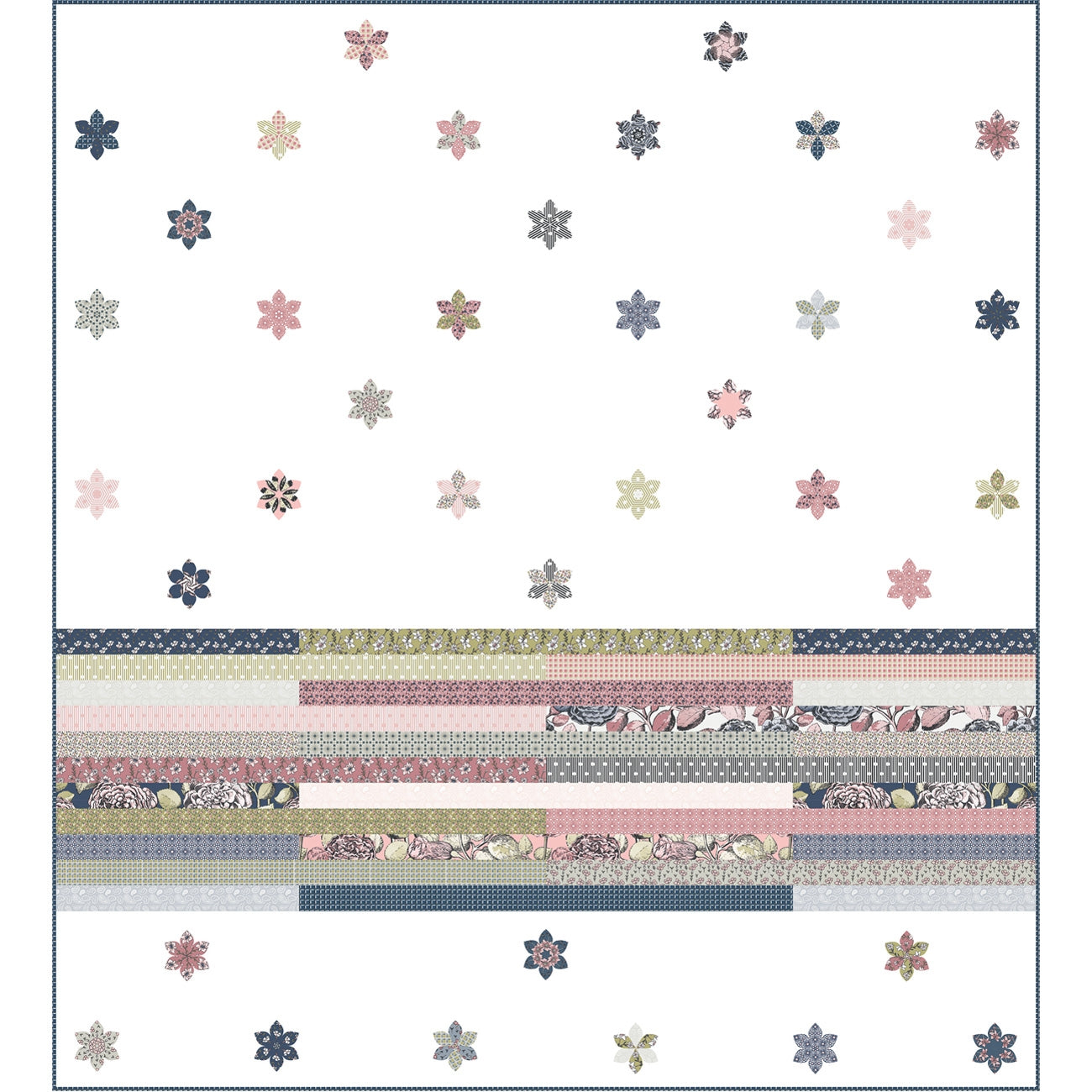 Artikelbeschreibung : Diese schlichte, aber elegante Steppdecke ist mit Blumen aus englischem Papier verziert, die auf weißem Riley Blake-Konfetti-Baumwollstoff appliziert sind, damit alle Drucke der Kollektion erstrahlen. Die einfache Verwendung der zusammengenähten Streifen, die in die Basis der Steppdecke eingenäht sind, stellt einen Bettläufer dar. Dies ist eine großartige Steppdecke, wenn Sie jeden Druck in einer Reihe verwenden möchten.