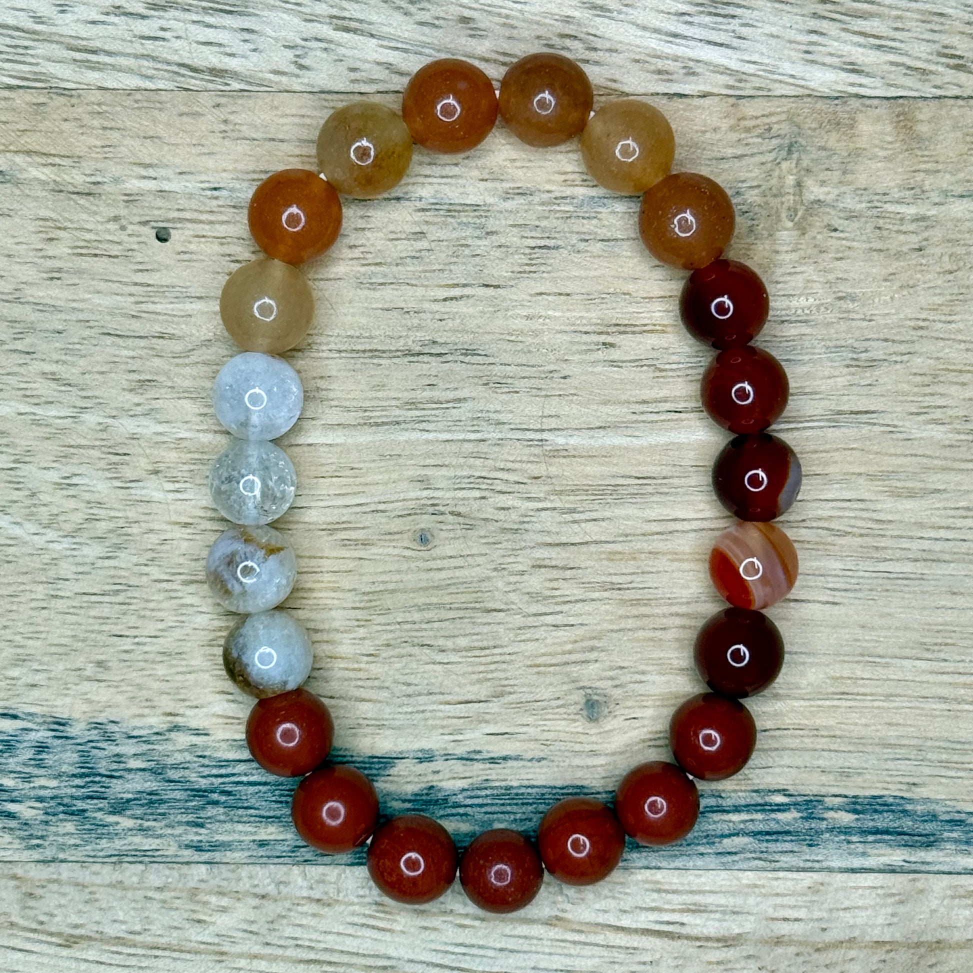 Crafted with 8mm stones in a radiant red palette, this bracelet blends citrine, carnelian, red jasper, and red aventurine, each chosen to inspire courage, strength, and self-assurance.