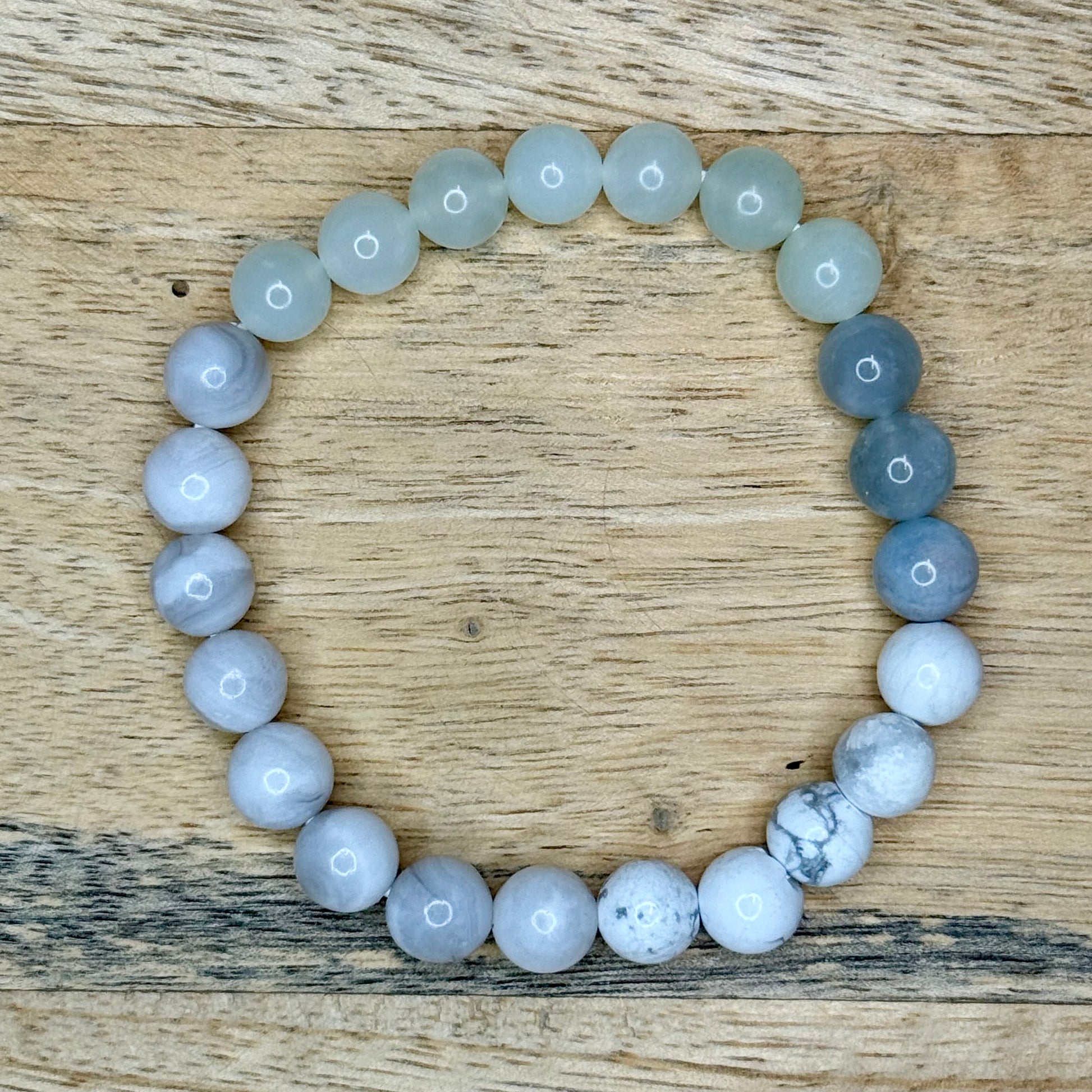 This calming blend of white-toned 8mm crystals, howlite, aquamarine, new jade serpentine, and white crazy lace agate is curated to support strength, abundance, and emotional balance.