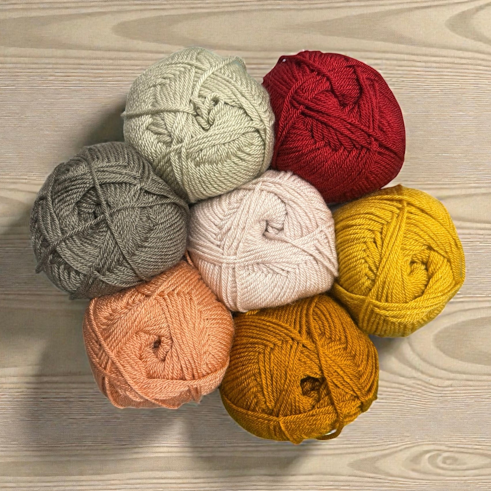 The Copperwood Collection Yarn Set brings together a warm, earthy palette with rich accents that feel natural and inviting. This set includes fourteen balls of Fiddlesticks Superb 8: five Natural, two Gold, two Stone, two Copper, one Sage, one Peach and one Cherry. The colours blend into a grounded, rustic mix with gentle pops of warmth and depth.