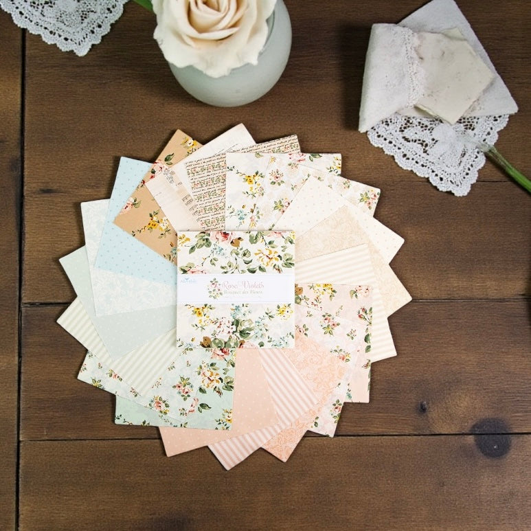The Rose and Violet’s Bouquet des Fleurs 10 Inch Stacker by Miss Rose Sister Violet includes 42 precut squares from this romantic, vintage-inspired collection. Each print appears two to three times within the bundle, offering a balanced mix of designs for quilting, patchwork and creative sewing. Linen prints from the collection are not included.