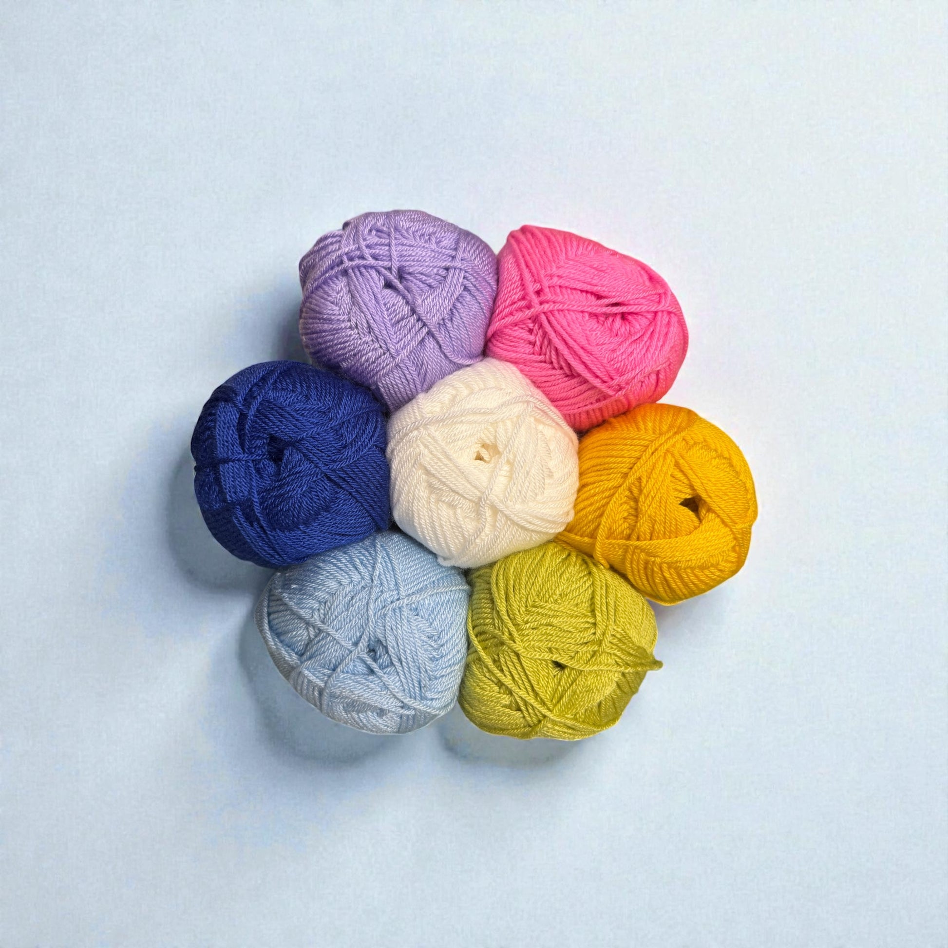 The Spring Pop Palette is a bright, fresh mix designed for makers who love clean whites paired with bold, playful colour. This set includes fourteen balls of Fiddlesticks Superb 8: five White, two Cobalt, two Duck Egg Blue, two Chartreuse, one Yellow, one Lilac and one Hot Pink. The combination feels crisp and modern, with cool blues and greens balanced by energetic accents.